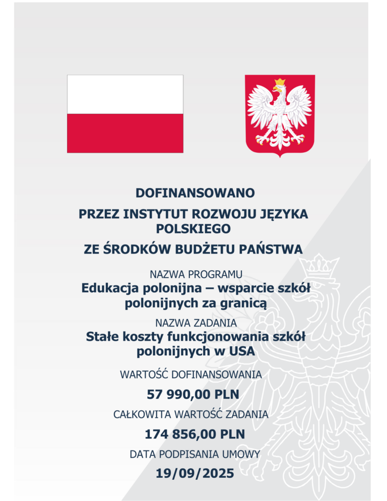 Z radością informujemy, że dzięki dofinansowaniu uzyskanemu przez Stowarzyszenie Wspólnota Polska, Polska Szkoła w Charlotte otrzymała pomoc finansową od Instytut Rozwoju Języka Polskiego , przeznaczoną na pokrycie kosztów działalności w semestrze jesiennym 2025. Środki te pomogły sfinansować m.in. wynajem sal lekcyjnych, wynagrodzenia dla nauczycieli, a także zakup nowej drukarki i laminatora.